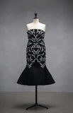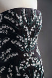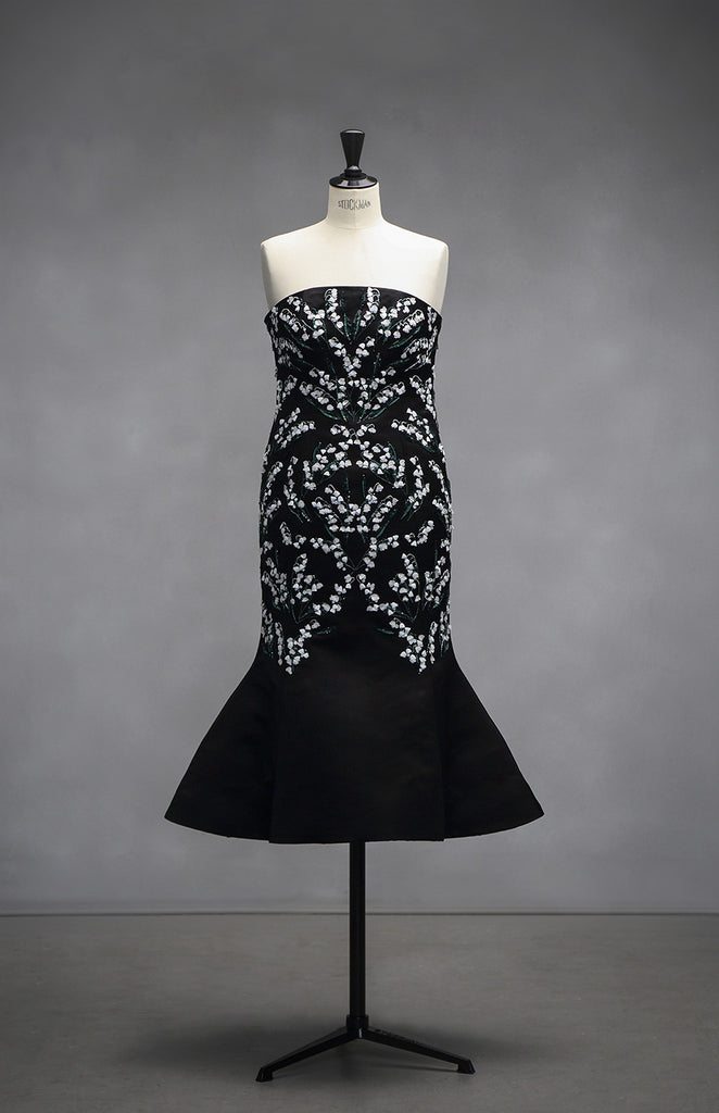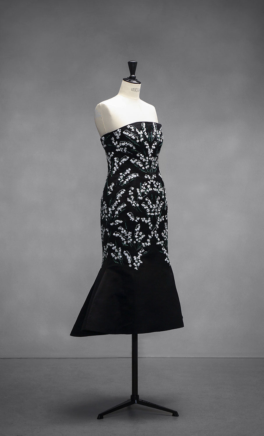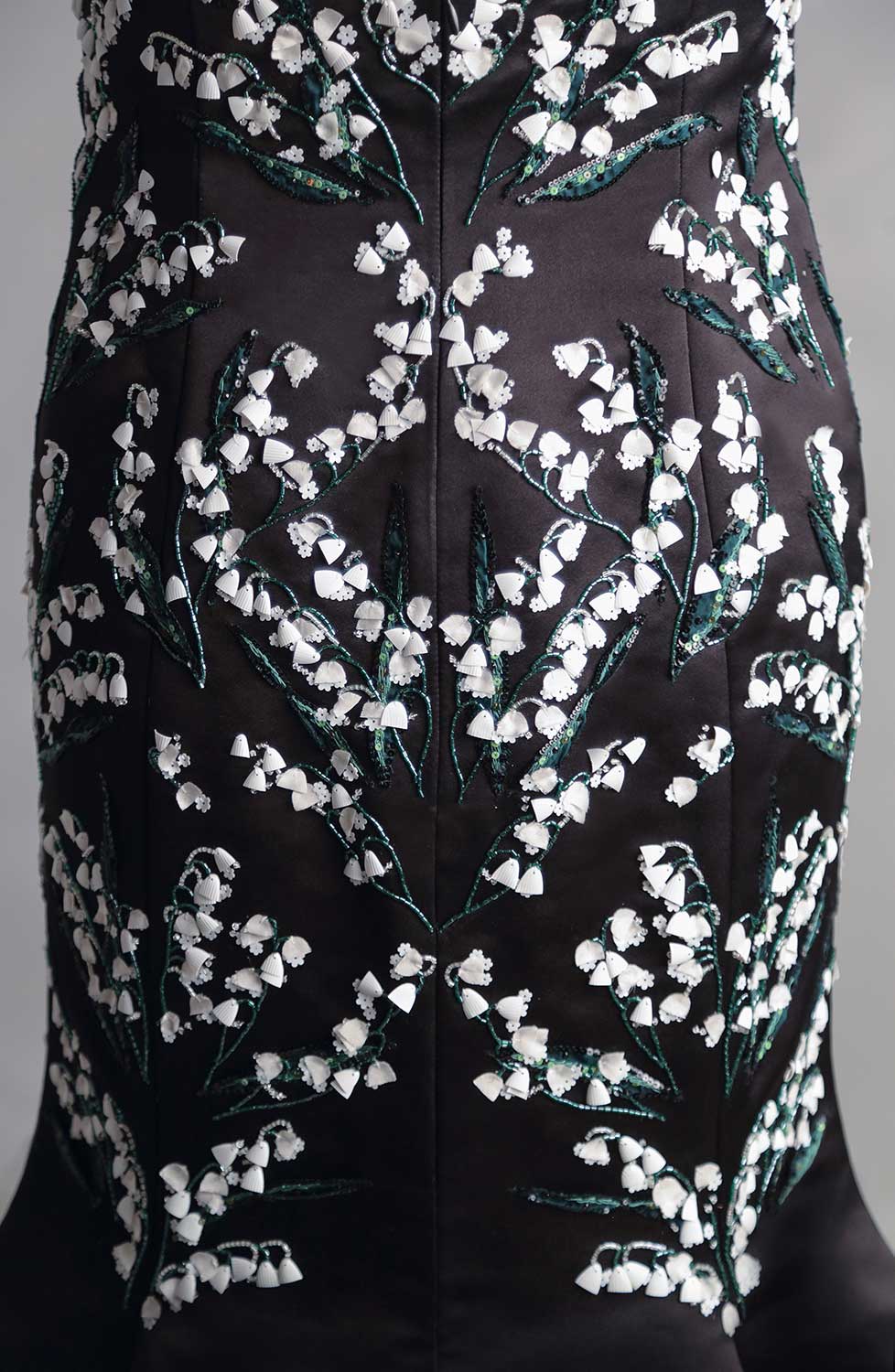 Inspired by hand-painted heirloom porcelain featuring delicate Lily of the Valley flowers, this gown embodies the savoir-faire of a true haute couture creation. The dress was expertly tailored from the finest black Italian silk and adorned with exquisite embroidery crafted to time-honoured traditions.