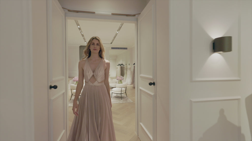 The ‘Gemma’ evening gown in luxurious printed crepe lamé in champagne rosé colour. Skirt and crinoline are pleated in voluminous plissé soleil accordeon. Hand-pleated bodice with hand-braided chaîne detail.