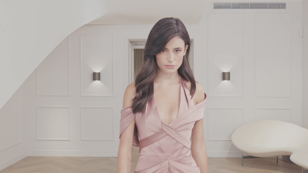 The 'Margot Gown' - in luminous double silk satin, the gown contours the body with quiet precision before drifting into a smooth, sweeping hem. The fabric’s dense weave gives it substance and poise, while its refined gloss catches the light with every step. Minimal seams, hand-finished details, effortless movement.