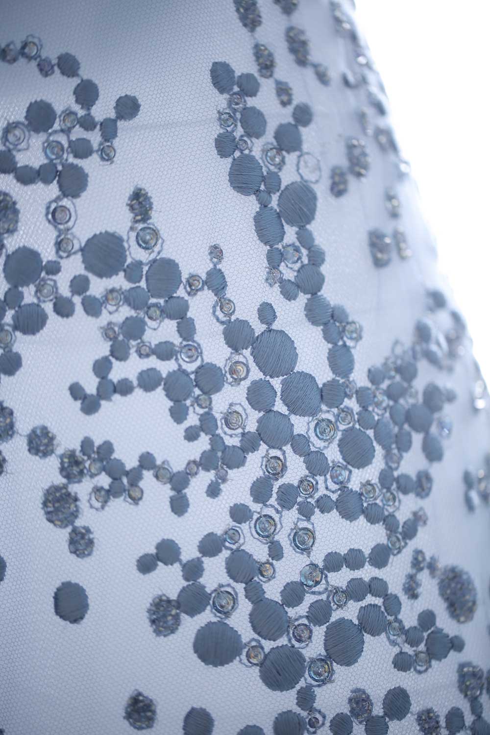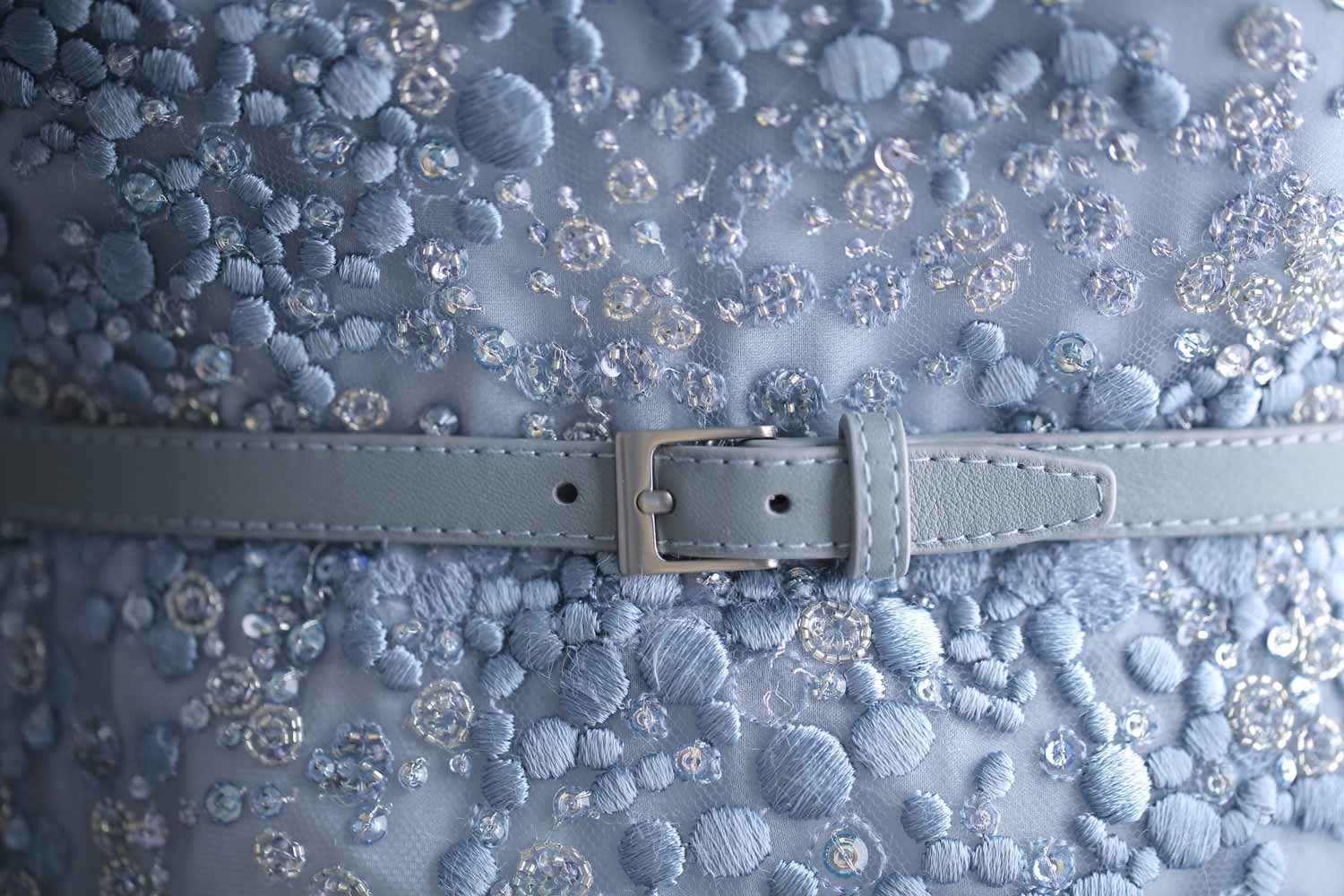 Ice Blue cocktail dress with snowflakes embroidery in silver and aquamarine Swarovski crystals.